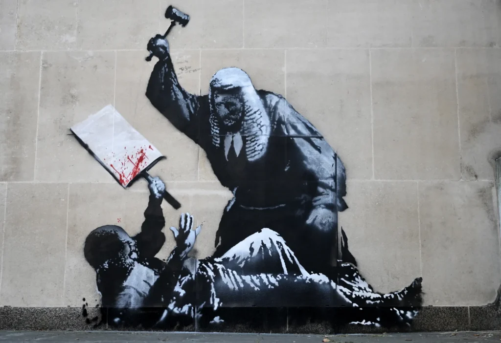 In September 2024, the world-renowned street artist Banksy painted a provocative mural on the side of the Royal Courts of Justice. The artwork depicted a British judge — complete with traditional wig and gown — striking a protester with a gavel, turning the judge’s tool of justice into a weapon of violence. Blood splatters formed the message on the protester’s blank placard, creating a grim symbol of suppressed dissent.